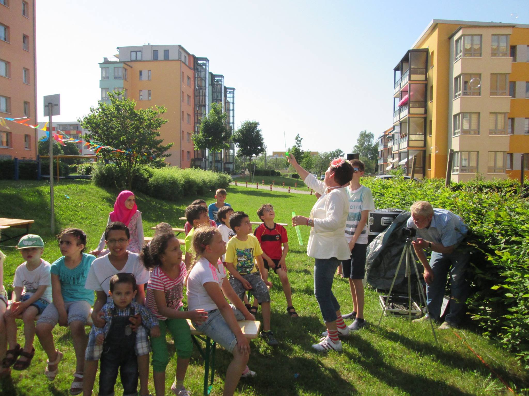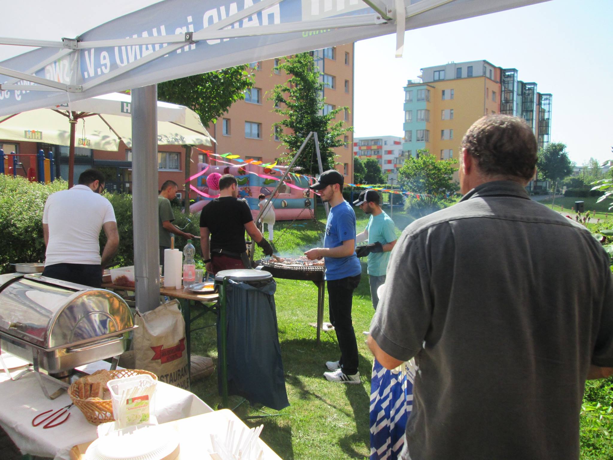 durchgeführt von Frau Wiese (HiH) vereinte die Kinder vieler Nationen. Senioren aus dem Quartier brachten den Kindern Luftballons mit. Die Mitarbeiter des Vereins Hand in Hand organisierten und betreuten das Fest. Das Grillen des Halalfleisches und der Bratwurst übernahmen syrische Bewohner.