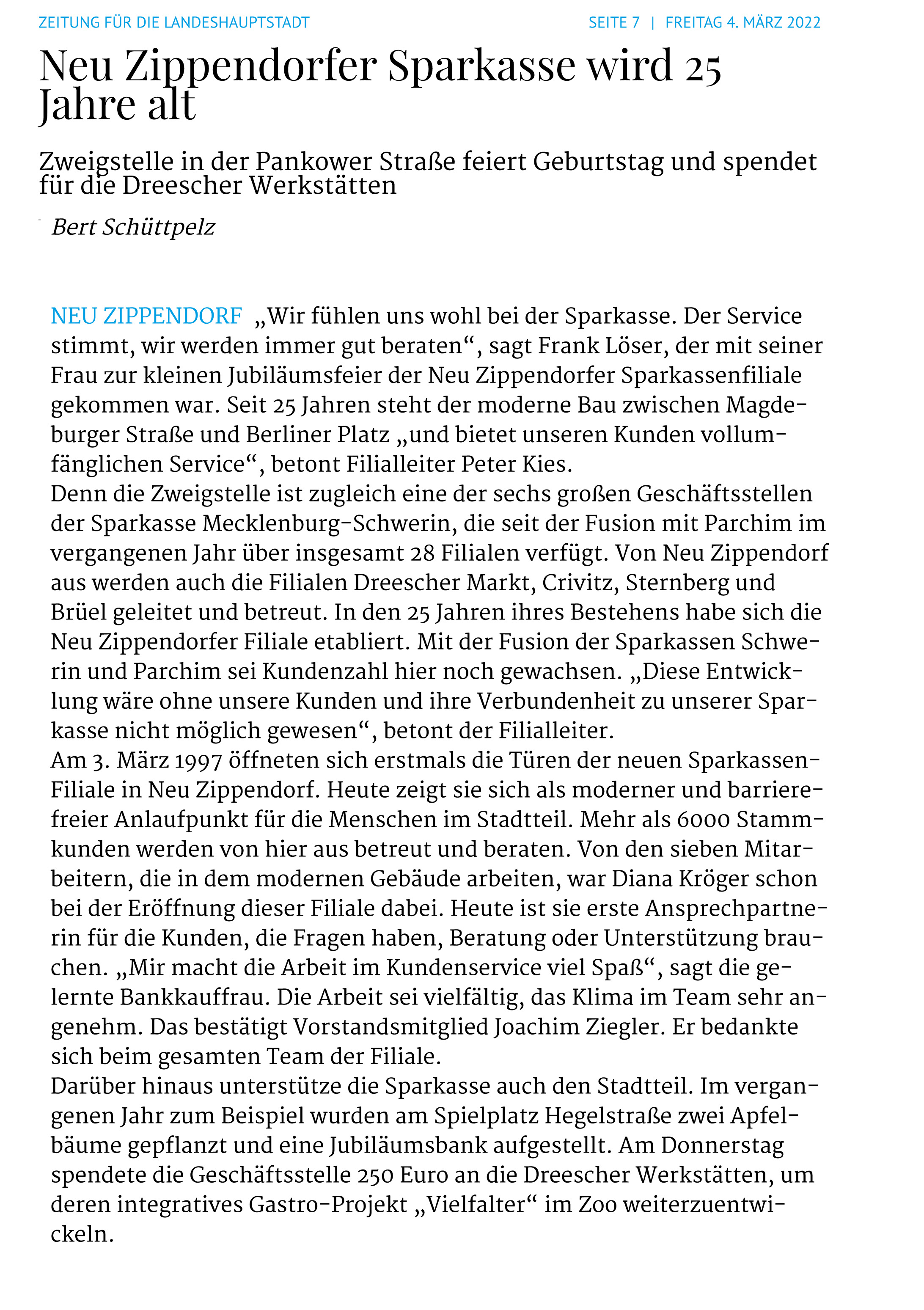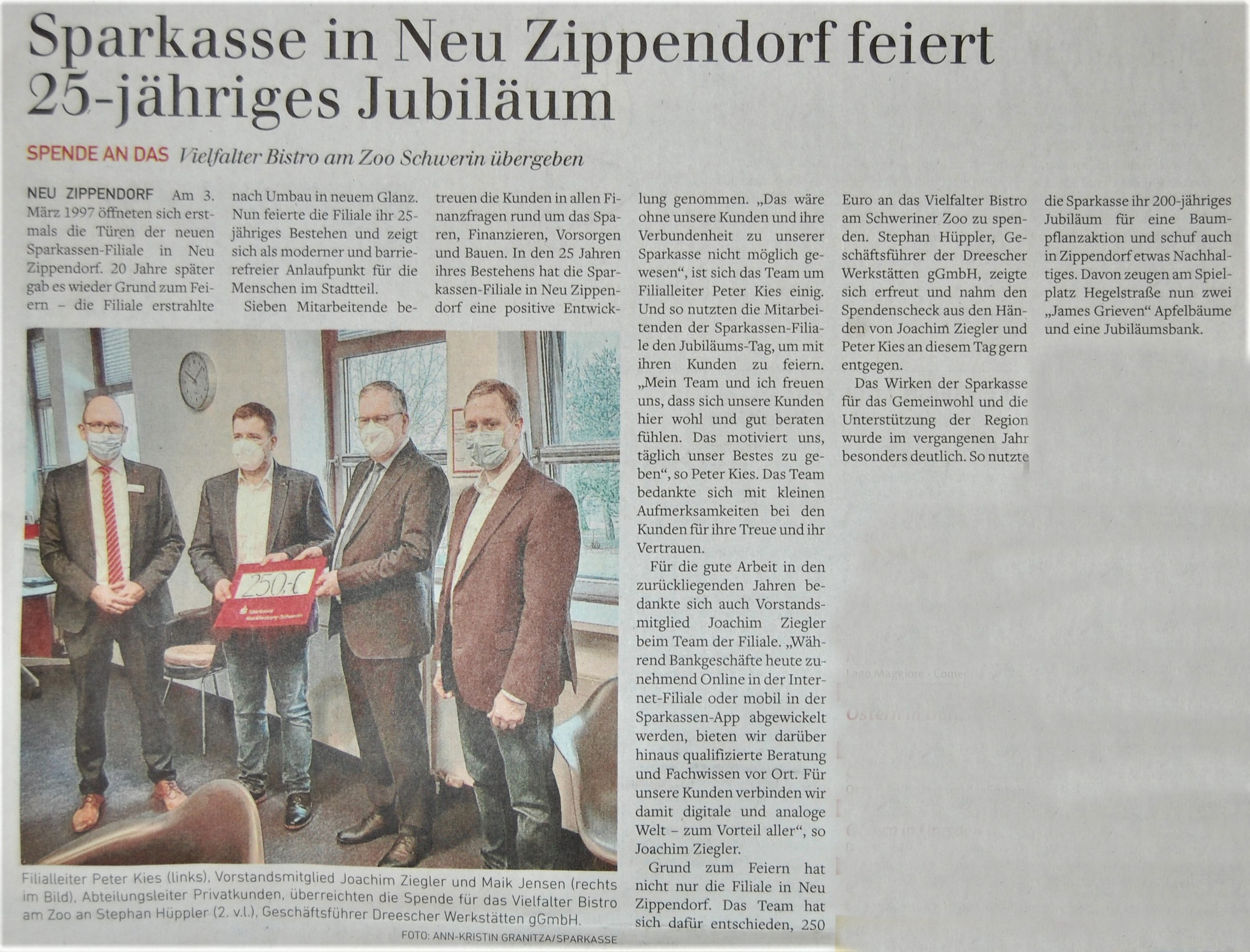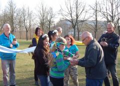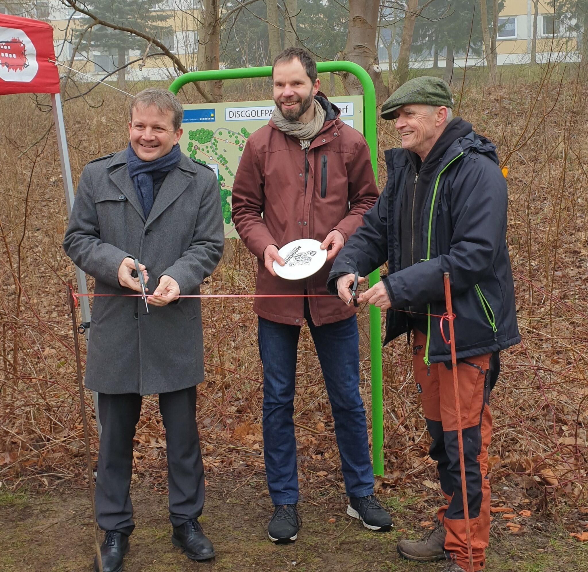 Oberbürgermeister Rico Badenschier weihte am 3. März gemeinsam mit dem Initiator, Frederic Werner, Matthias Glüer vom Bauspielplatz und zahlreichen Gästen den Disc-Golf Parcours ein. Es war nicht gerade einfach für Frederic Werner seine Idee von einem Disc-Golf Parcours in Schwerin umzusetzen, die er aus einem Urlaub in Skandinavien mitgebracht hatte. Wie beim Golf folgt man einem Parcours und muss versuchen, eine Frisbee-Scheibe mit möglichst wenigen Würfen in einem Metallkorb zu platzieren. Ein Spiel in der Natur für alle Altersgruppen. Der passende Ort für einen 9-Korb Parcours und das erforderlich Geld war nicht einfach zu beschaffen. Schließlich landete Herr Werner in Neu Zippendorf, wo er mit dem Bauspielplatz, dem Stadtteilmanagement und dem Ortsbeirat engagierte Unterstützer fand. Gemeinsam konnten das Geld beschafft und alle organisatorischen Hürden genommen werden, so dass nun auch in Schwerin Disc-Golf gespielt werden kann. Die dafür notwendigen Frisbee-Schreiben kann man sich sogar im Feuerwehrmuseum ausleihen, so dass es jedem möglich ist, das Spiel ohne jegliche Anschaffungen auszuprobieren.