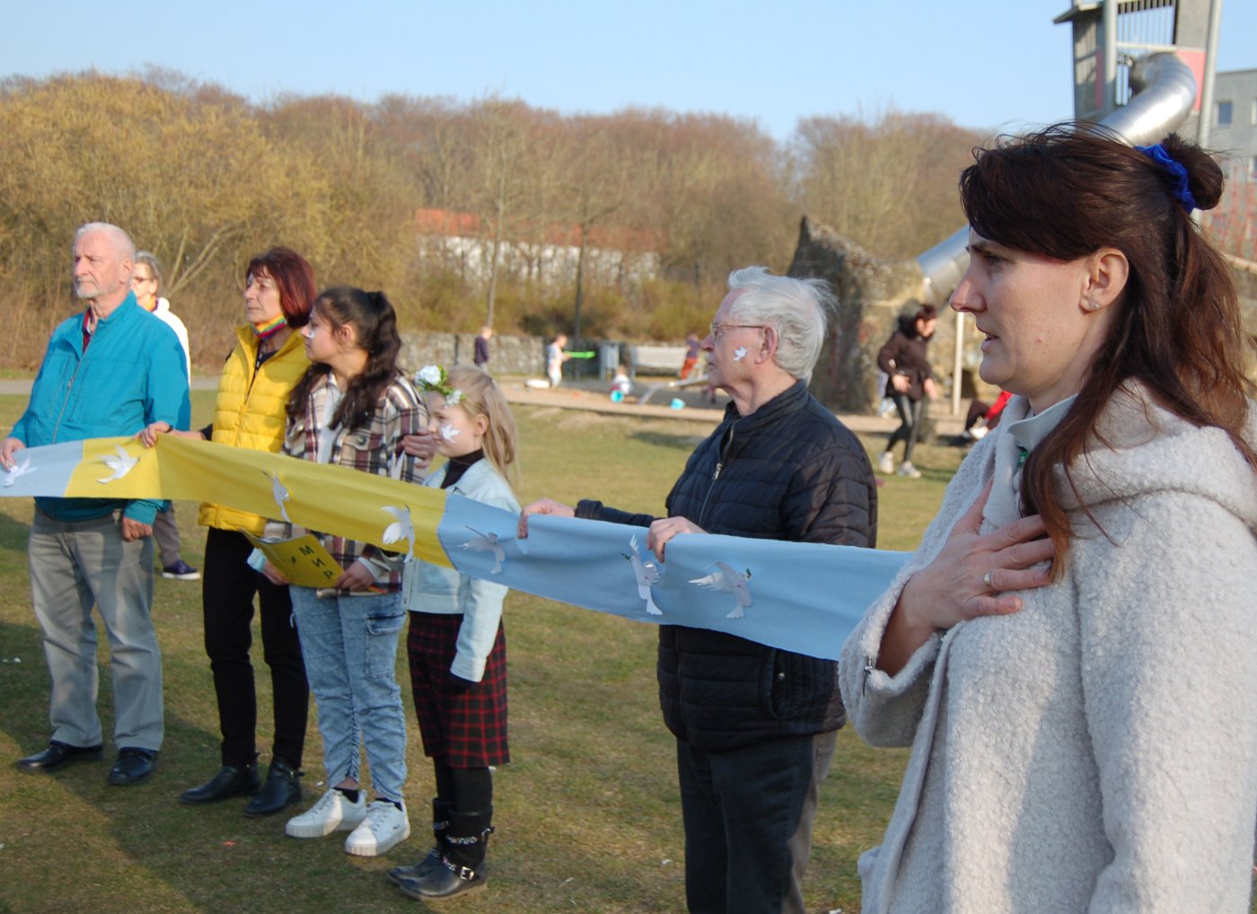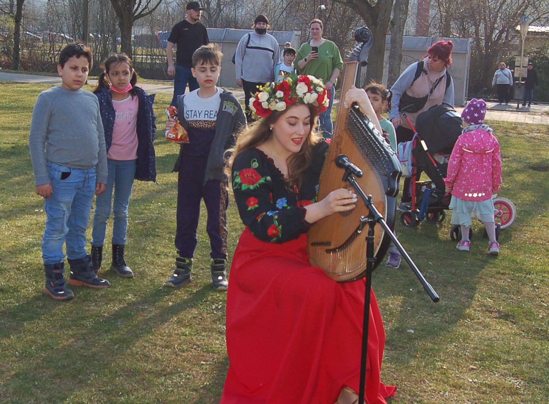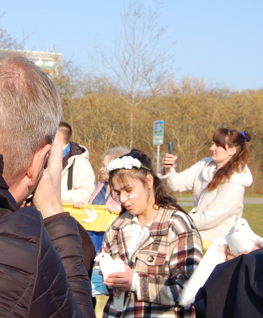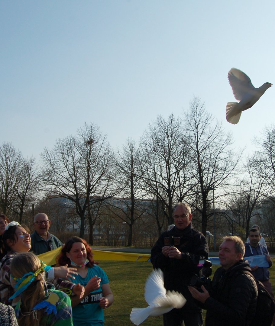 Es waren bewegende Momente auf dem Keplerplatz, als die Tauben in den Himmel flogen, Paulina mit den "Plattelinos" das Lied von der kleinen weißen Friedenstaube sang, Svetlana Nikonorova mit ihrer Bandura Lieder aus der Ukraine spielte, sich Oksana Schoorlemmer im Namen des Ukrainisch-Deutschen Kulturzentrums SIC an die Teilnehmer wandte und am Ende die ukrainische Nationalhymne erklang. Auch wenn nicht alles nach Plan lief, so war es doch ein schöner Moment der Solidarität, verbunden mit der großen Hoffnung auf Frieden in der Ukraine, in Europa und der ganzen Welt.