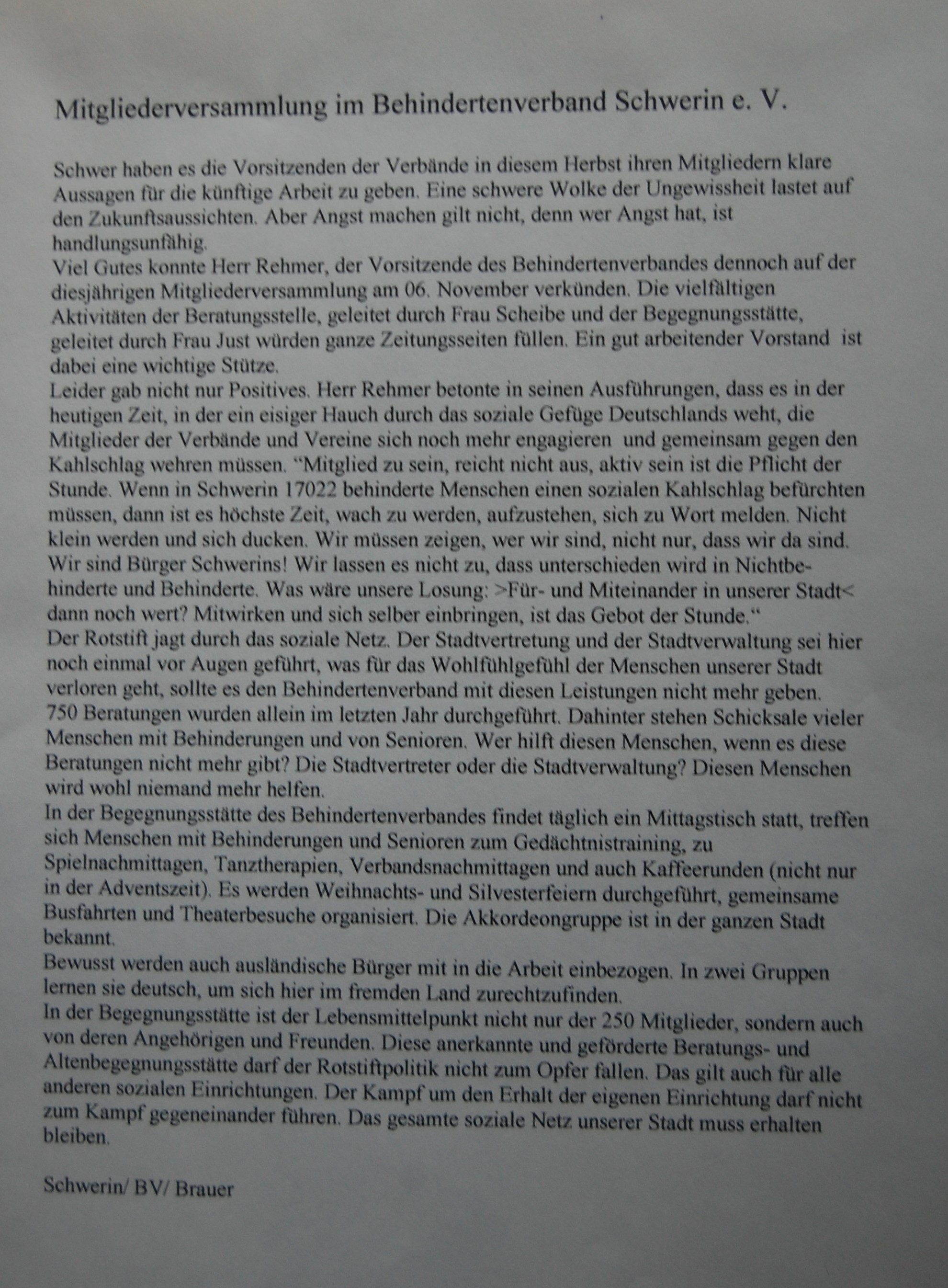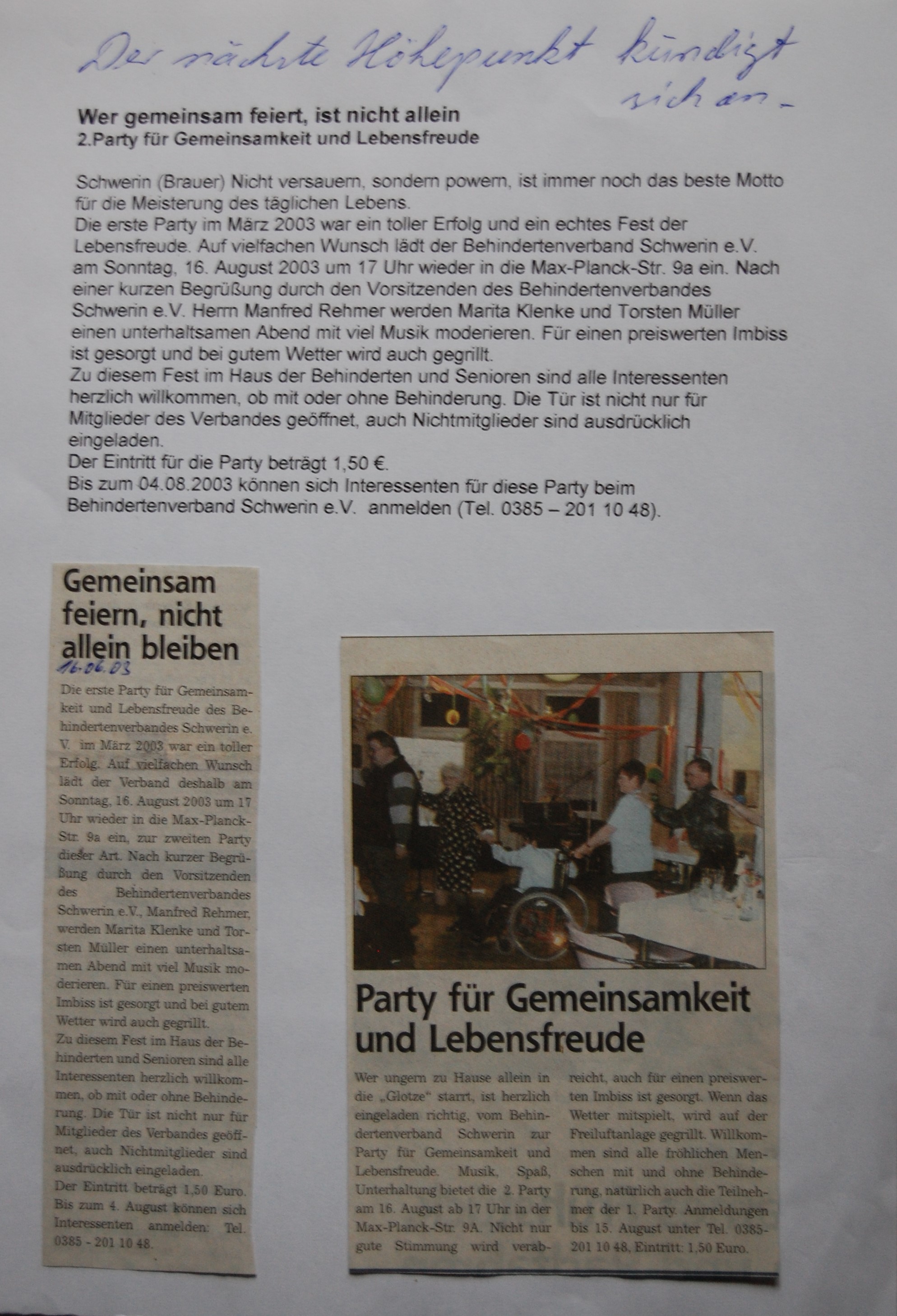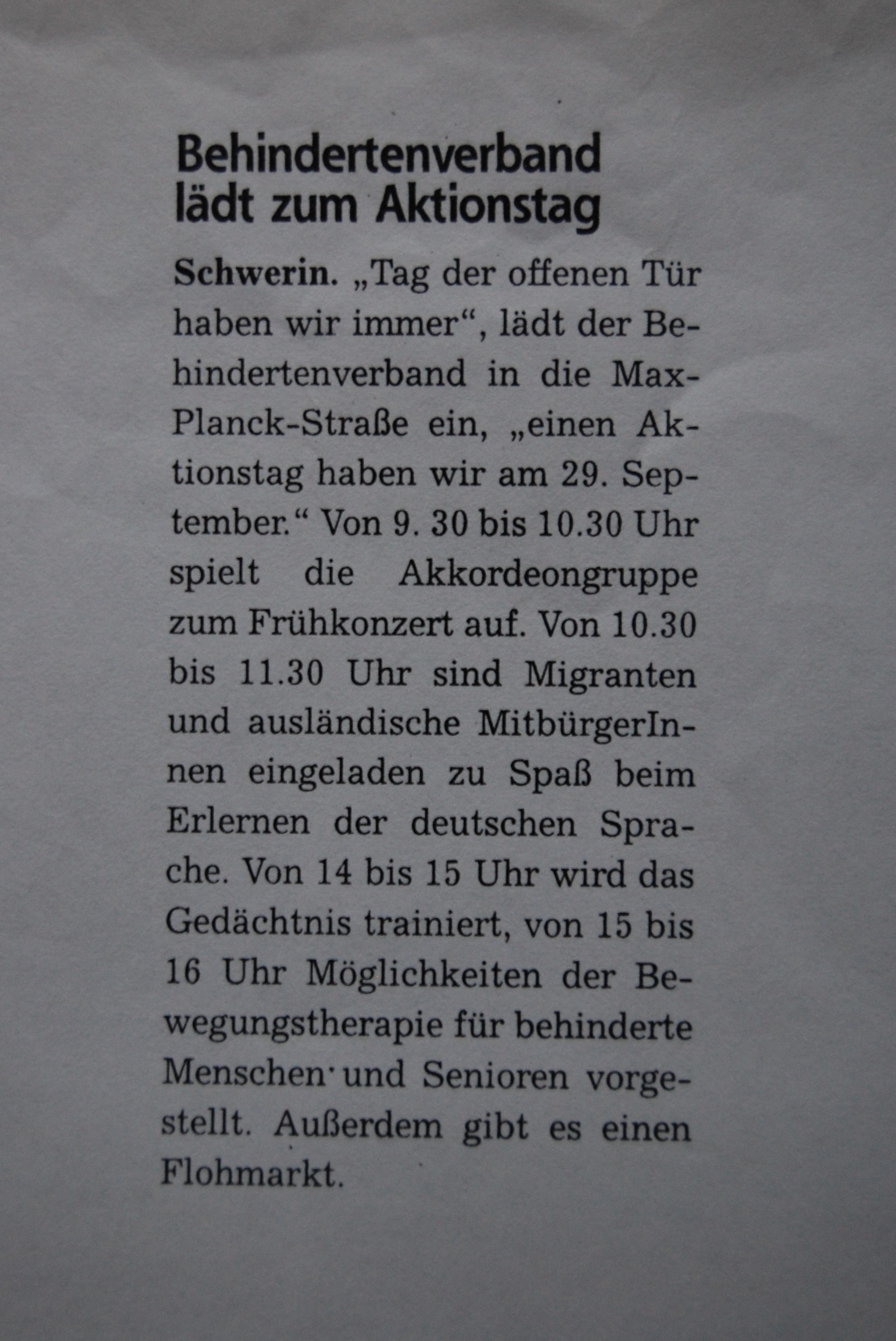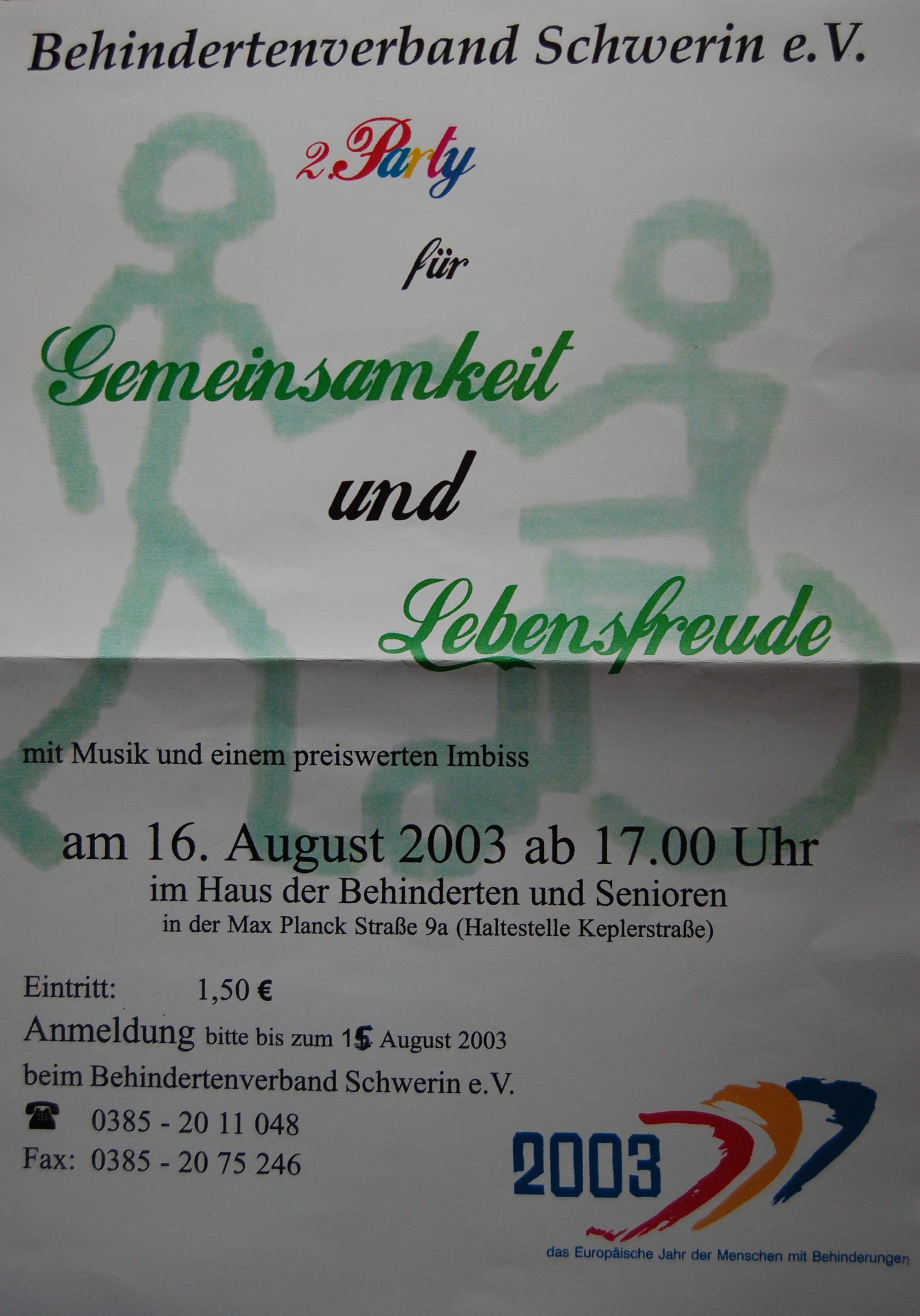 Veranstaltungen des Behindertenverbands Schwerin im Bertha-Klingberg-Haus ab 2003
