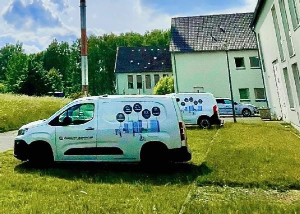 Auch die Fahrzeuge eines großen Reinigungsdienstleisters stehen auf dem Gelände.