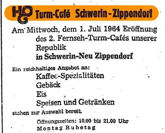 Am 1.Mai 1964, also zwei Monate eher wie das Turm-Café in Schwerin. Demnächst kommt dazu ein ausführlicher Beitrag über den Turm auf dem Kulpenberg (Kyffhäuser)