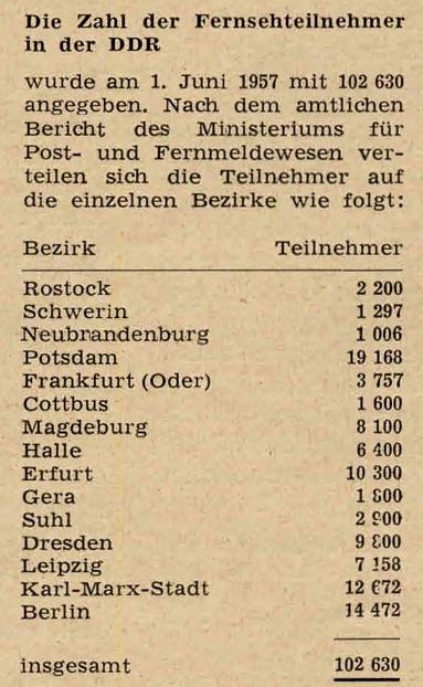 Der Bezirk Schwerin hatte zum 1.Juni gerade mal 1297 gemeldete Empfänger. Davon waren sicher einige für das in weiten Teilen des Bezirkes bereits empfangbare Westfernsehen gekauft worden.