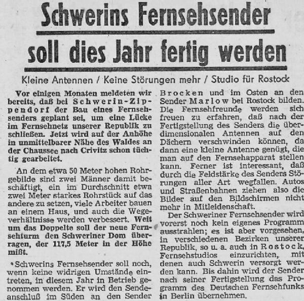 Am 15. August 1957 nimmt der Fernsehsender in Schwerin Zippendorf seinen Betrieb auf. Er ist fast 274 m hoch und in so kurzer Zeit gebaut worden. VHF Kanal 11 CCIR-Norm-