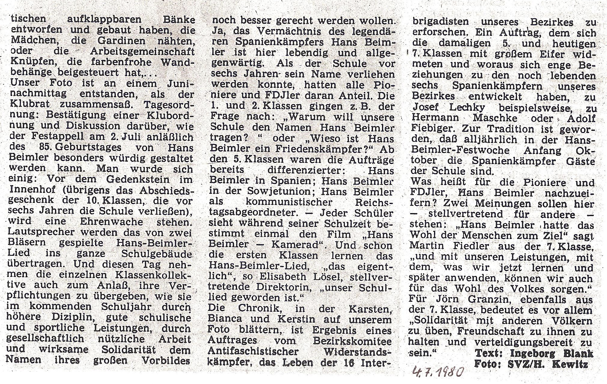 Neben Persönlichkeiten der Stadt Schwerin waren Willi Höhn, Freund und Kampfgefährte H. Beimler und Hans Kukowitsch, Spanienkämpfer, anwesend