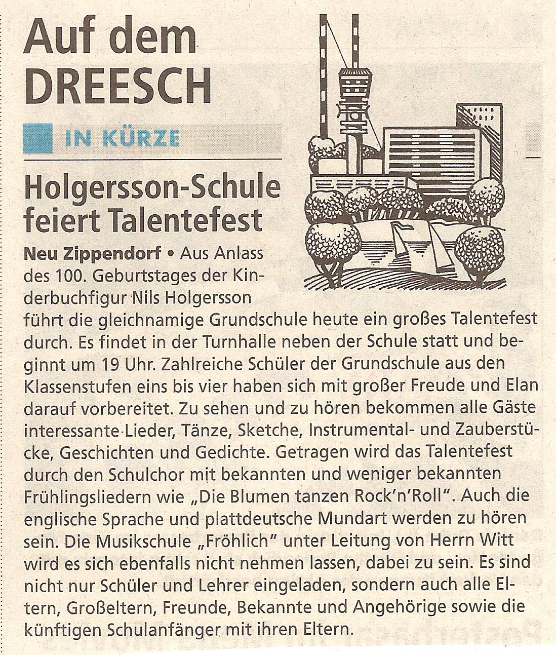 Zu einem Tag der offenen Tür lädt am 27. September die Nils-Holgersson-Grundschule in der Friedrich-Engels-Straße alle Schulanfänger 2008/2009 und deren Eltern ein. Von 16 bis 18 Uhr können sich die Mädchen und Jungen die Schule ansehen, schon einmal einen Blick in die Klassenräume werfen und an verschiedenen Stationen gibt es Gelegenheit zum Malen und Basteln.