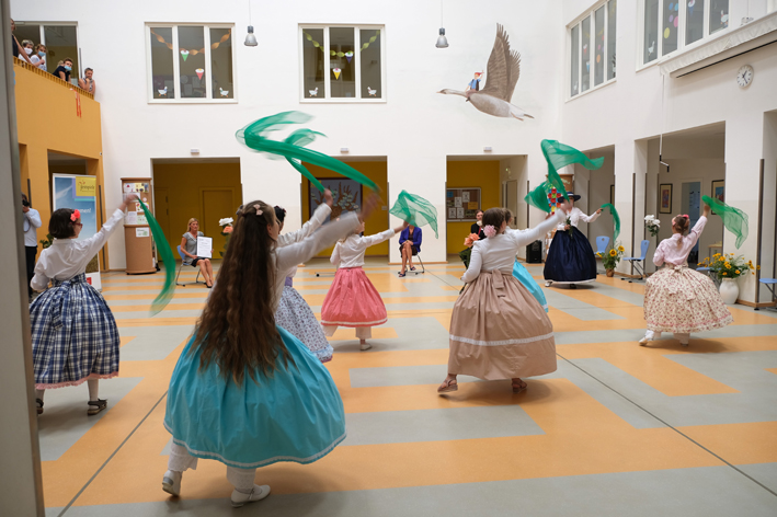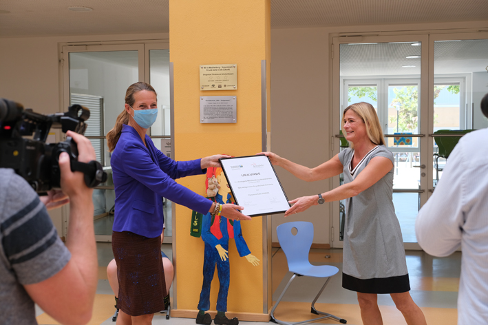 Die Nils-Holgersson-Grundschule in der Landeshauptstadt Schwerin ist neue Partnerschule der Festspiele Mecklenburg-Vorpommern im Schuljahr 2020/2021. Bildungsministerin Bettina Martin und die designierte Festspielintendantin Ursula Haselböck haben am Donnerstag, den 6. August 2020 bei einer Feierstunde mit Schülerinnen und Schülern sowie den Lehrkräften rund um Schulleiterin Carola Pietsch die Ernennungsurkunde übergeben.